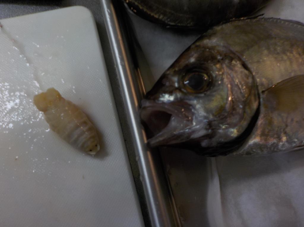 で、でたーーー。ウオノエ。カイワリによくいる寄生虫です。ちっちゃいダイオウグソクムシみたいなやつです。特に害はありませんが知らないとビックリします。