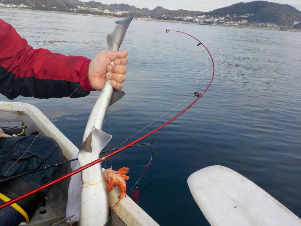 ビシタックル初獲物は80センチのホシザメ君でした。去年大津で三平クンが釣ってたっけ…
