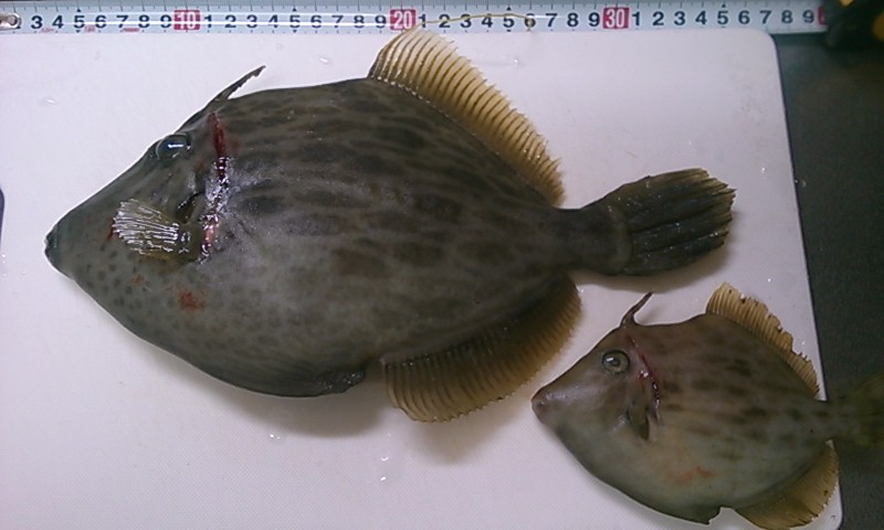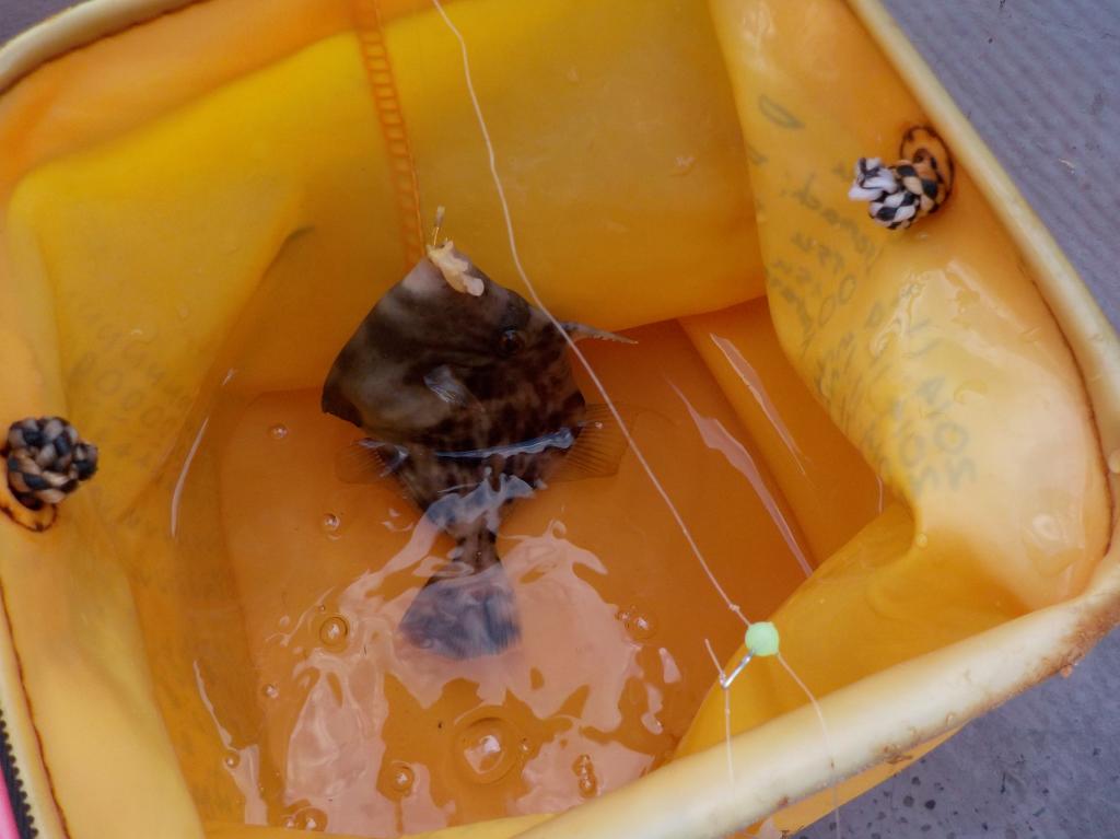 投入後、しばらくして従来竿が何となくピクピクしていたので合わせるとワッペンカワハギHIT