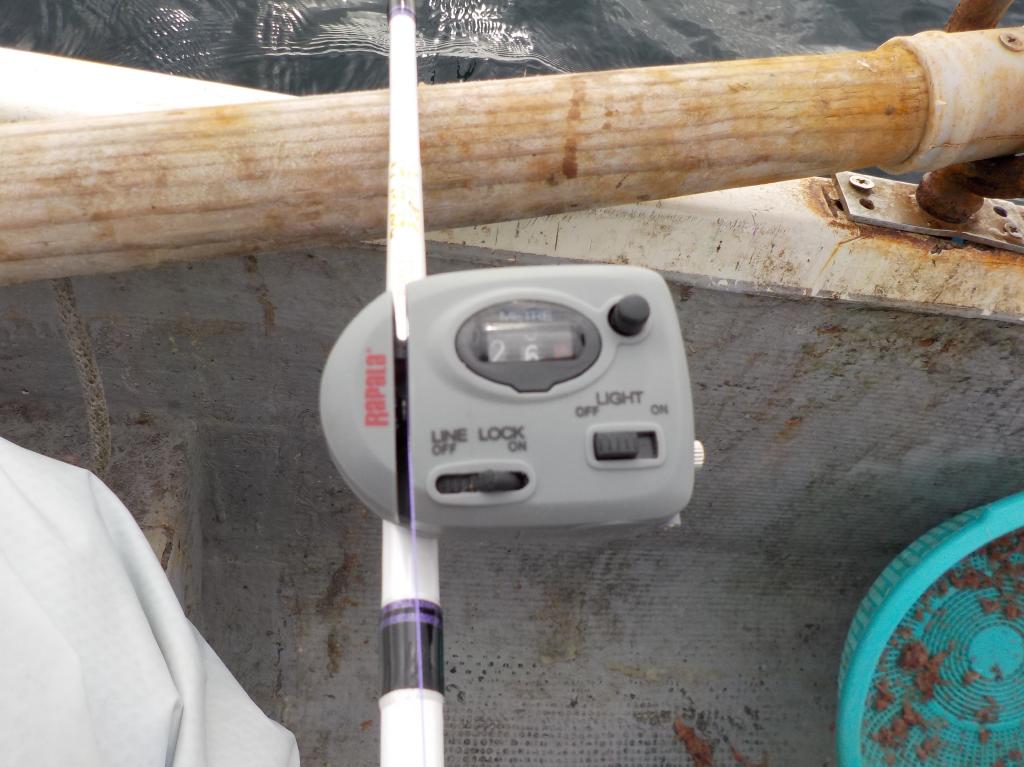 あまりにも渋いので、ラパラのカウンターで水深測定。いや~両軸だとこんなに便利なものとは。スピニングで使っていた時は海に背中向けてリールを変な向きにして使っていたんだが…。
