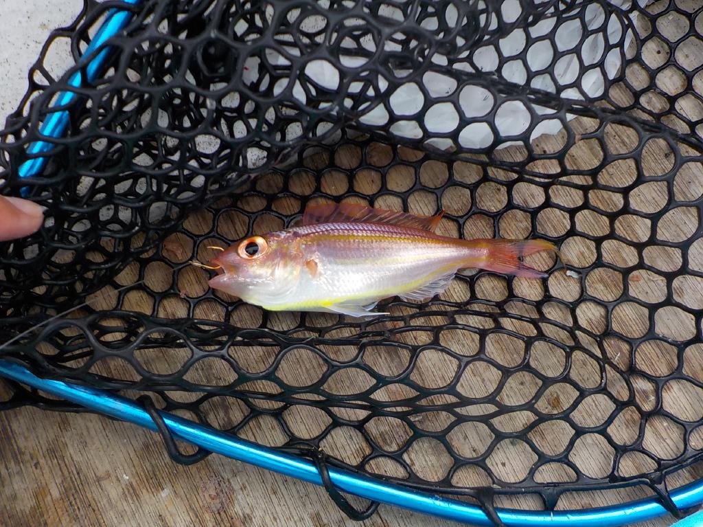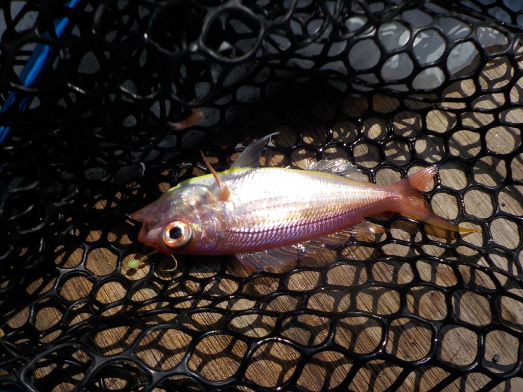 ミニミニイトヨリ。ネンブツダイかと思ったくらい。前回の三平クンのモンスターイトヨリを見てるのでリリース。